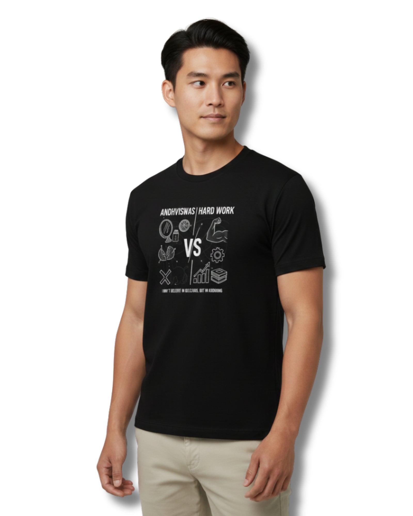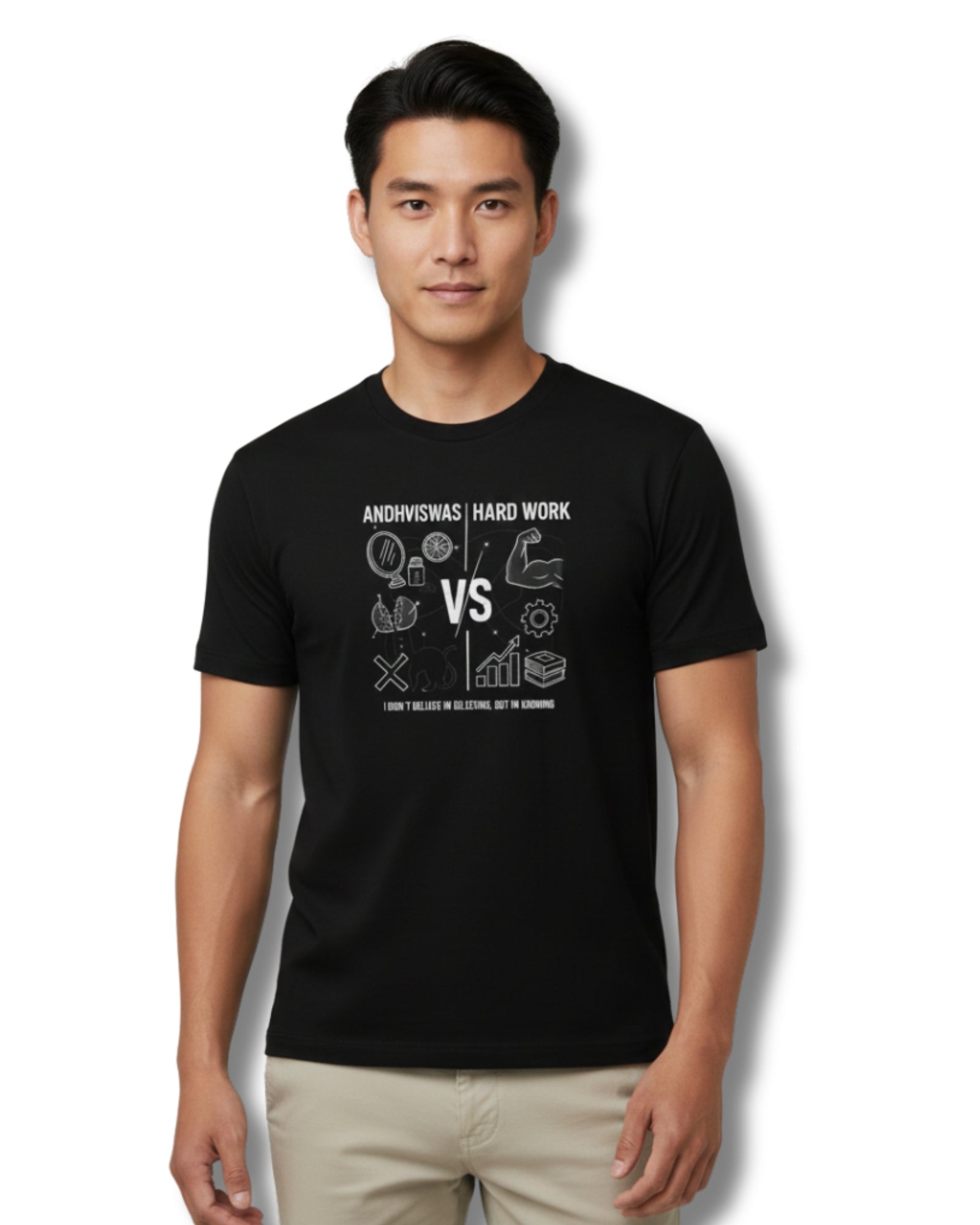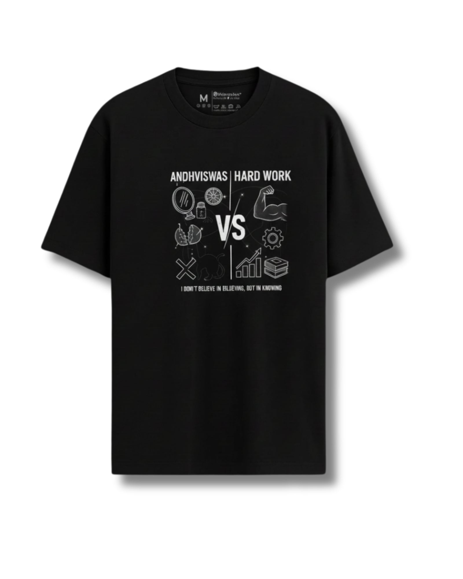 This t-shirt is the wearable manifesto of our Andhvishwas vs. Hard Work campaign. Featuring the powerful statement, "I Don't Believe in Believing but Knowing," it's a tribute to logic, effort, and self-made success. It's a call to action to value verifiable knowledge and hard work over unfounded belief.